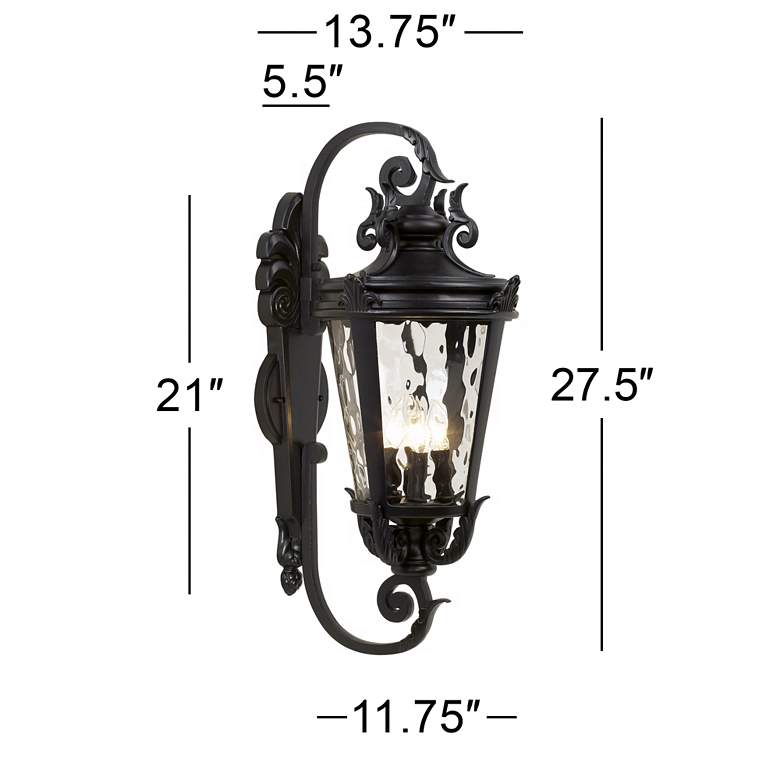 - 7 1/2" high x 11 3/4" wide. Extends 13 3/4" from the wall. Backplate is 21" high x 5 1/2" wide. Mounting point to top of fixture is 14". Weighs 11.4 lbs.