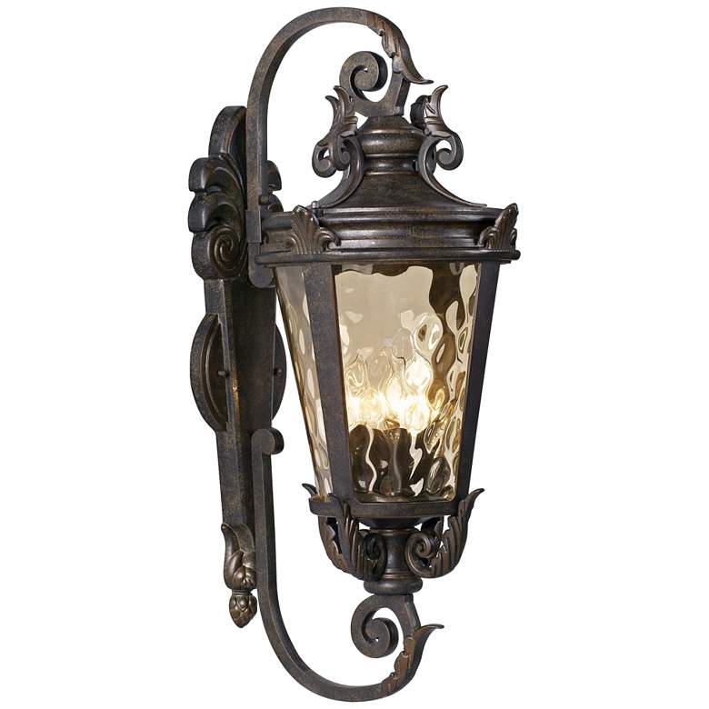 The lavish Mediterranean styling of this outdoor wall recalls the romance and magic of the French port city of Marseille. This beautiful four-light fixture features champagne hammered glass paired with rich detailing and a warm bronze finish in a study die-cast metal construction. Use it to illuminate walkways and patios, or install it as a porch light for instant curb appeal.